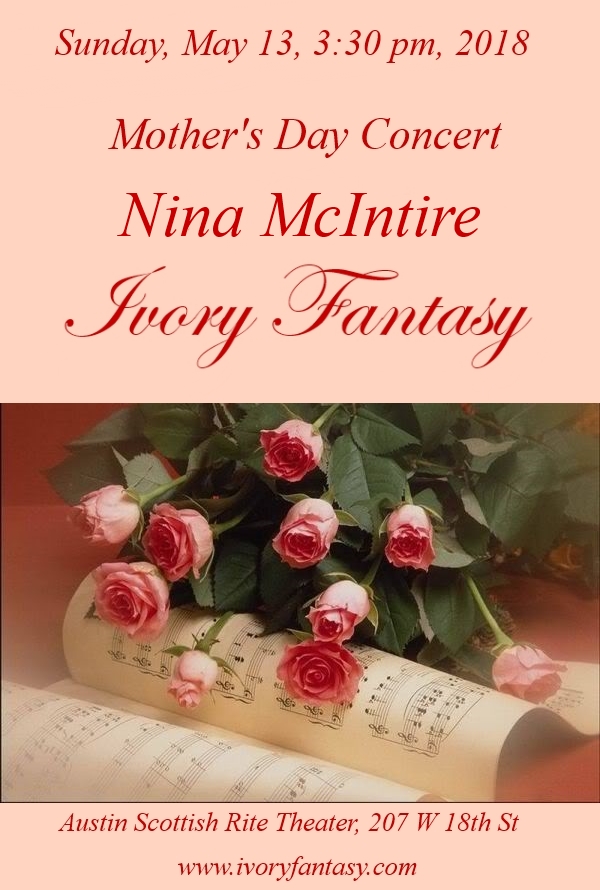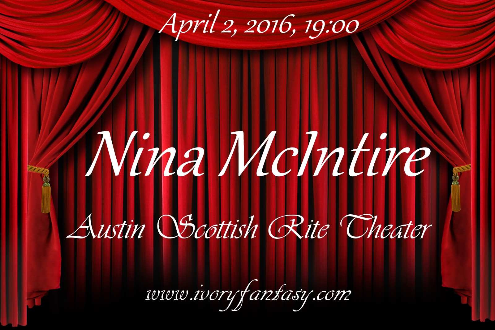 Austin, TX Concert April 2, 2016, Nina McIntire, Ivory Fantasy, 7:00 PM Scottish Rite Theater, 207 W 18th St, Austin, TX, USA