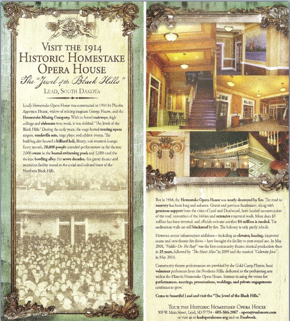 Concert at the Homestake Opera House We will be having a concert at the Lead Homestake Opera House in the Black Hills of South Dakota at 7:00 PM on July 23rd. The Opera House was burned by fire and this concert is to generate funds to rebuild it. If you can, please support the Opera House and come to the concert.
