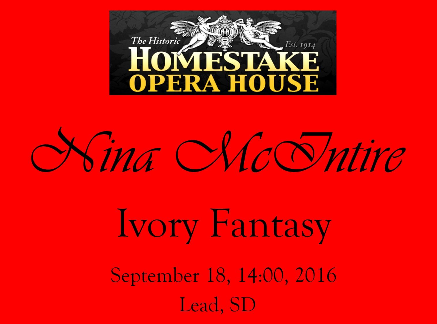 Sunday September 18, 2016, Nina McIntire, Ivory Fantasy, 2:00 PM Historic Homestake Opera House, Lead, SD, USA
